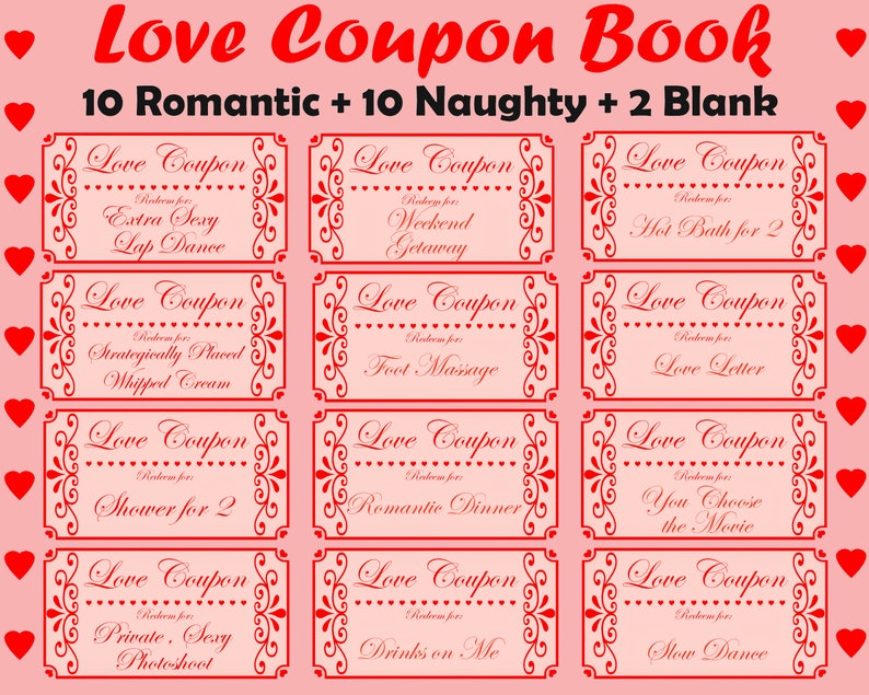 Valentine Coupons | Etsy Love Coupon Book, Printable Coupons for him/ for her, Valentine's day love coupon book, Valentine's day gift for him, DIY gift, Couple DarcysParty (227) $3.99 Bestseller printable Love coupons for him, naughty coupons, sex coupons, valentines coupon book, anniversary coupon book, kinky coupons for birthday Luxefinegifts (97) $4.33 Bestseller Free Printable Valentine's Day Coupon Book - Smart Savvy Living This free printable Valentine's Day coupon book is the perfect frugal Valentine's Day gift idea that's really from the heart. When Mr. Savvy and I first moved in together, we didn't have a ton of extra money, like most new couples. We've never been huge gift-givers, instead opting for small gestures and tokens of our affection for each other. Love Coupons for Him: Valentines Day Coupon Book for Husband or ... by Magical Luv Dust Co Paperback $7.99 Sex Coupons For Him: 50 X rated, Sexy, Dirty, Naughty & Pure Filthy Vouchers For Husband, Boyfriend. Valentines Gift, Anniversary, Birthday, Christmas. (Warning Adventurous Only) by Kinky Luv Paperback $7.99 Printable love coupon book -the perfect Valentine's Day gift! Free love coupons template download below. The book measures 8″x3.5″ and the pages will print out just fine on regular 8.5″x11″ paper. But I do recommend using a cardstock paper so it is a little bit more durable. All you need to do is download the book using the link above and cut them out.