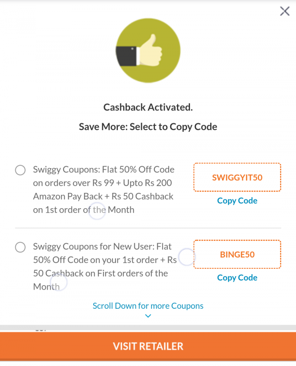 Swiggy Coupons & Offers | FLAT 60% Discount Code - June 2022 New User ( 1) Automatically apply the Best Coupon or Deal directly on your cart & Earn Extra Cashback on every purchase. Click Here FLAT 50% OFF 50 Likes TC Recommended Grab FLAT 50% Discount on Selected Restaurants Flat Rs. 10 TalkCharge Cashback how-it-works Activate Cashback Enjoy Flat 50% OFF on ordering Food online from Swiggy. ... Show More