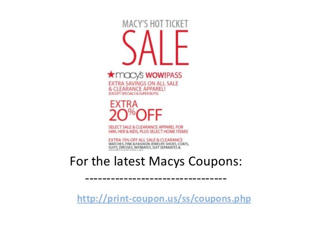 Printable Coupon 2016 - Blogger Macys Printable Coupons July 2016 Macy's is one of those stores scattered sites online that offer a variety of discount items on macys coupons July 2016 for products that include clothing and accessories for men, women and children. to get 30% off Macys Printable Coupons July 2016 to be used as a deduction from the price. Macys Coupons retail 20% Off Macy's Coupons, Promo Codes + 6% Cash Back 2022 - RetailMeNot.com All Cardmembers! 25% Off Any Day With Macy's Star Passes 118 uses today See Details 25% OFF Sale 25% Off Your Next Order With Macy's Email Sign Up 65 uses today See Details FREE SHIPPING Sale Free Shipping on $25+ 13 uses today See Details UP TO 60% OFF Sale Up to 60% Off Back To School Kids' Deals 34 uses today See Details UP TO 70% OFF Sale 15% Off Coupon at Macy's 15% Off Coupon at Macy's ... present coupon to in-store Sales Associate or use promo code at online checkout. See below for details: COUPON CODE: MORSLP. VALID 4/10-4/14/13. EXTRA 15% OFF ALL SALE & CLEARANCE! ... Specials, web busters™, purchases in Macy's stores or prior purchases, payments on credit accounts, gift wrap or shipping ...